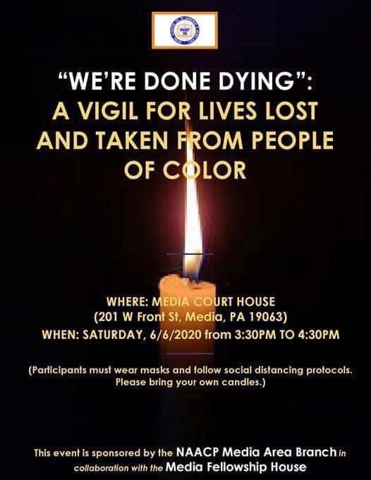 Saturday’s vigil is backed by FUSE Delco and the Interfaith Council of Southern Delaware County, which asks those attending to please be mindful of all social distancing rules and recommendations. #WeAreDoneDying #FUSEDelco #InterfaithCouncilofSouthernDelawareCounty #NAACP #MediaFellowshipHouse #GeorgeFloyd #chestereastside