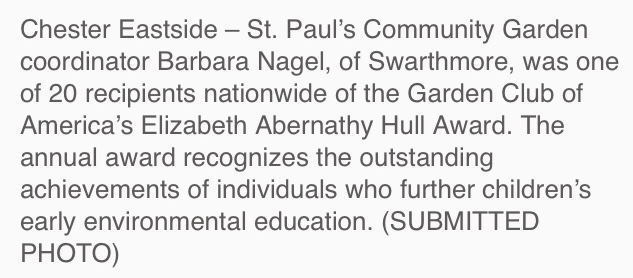 Read all about Barbara’s award from the Garden Club of America. https://www.delcotimes.com/2022/06/16/swarthmore-resident-wins-garden-club-of-america-award-for-work-with-chester-eastside-garden/