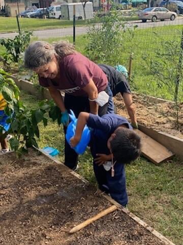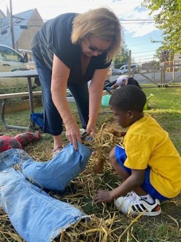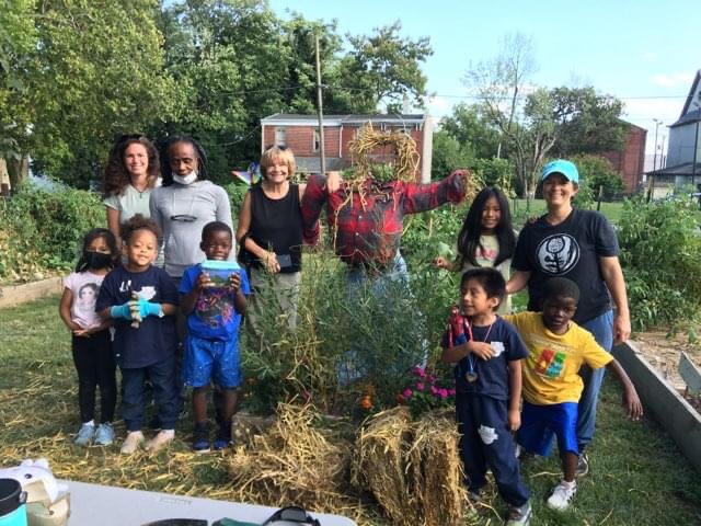 Notice anybody new in the garden? In addition to watering and picking, the children put up the scarecrow. Fall is here! #communitygarden #scarecrow #chestereastside